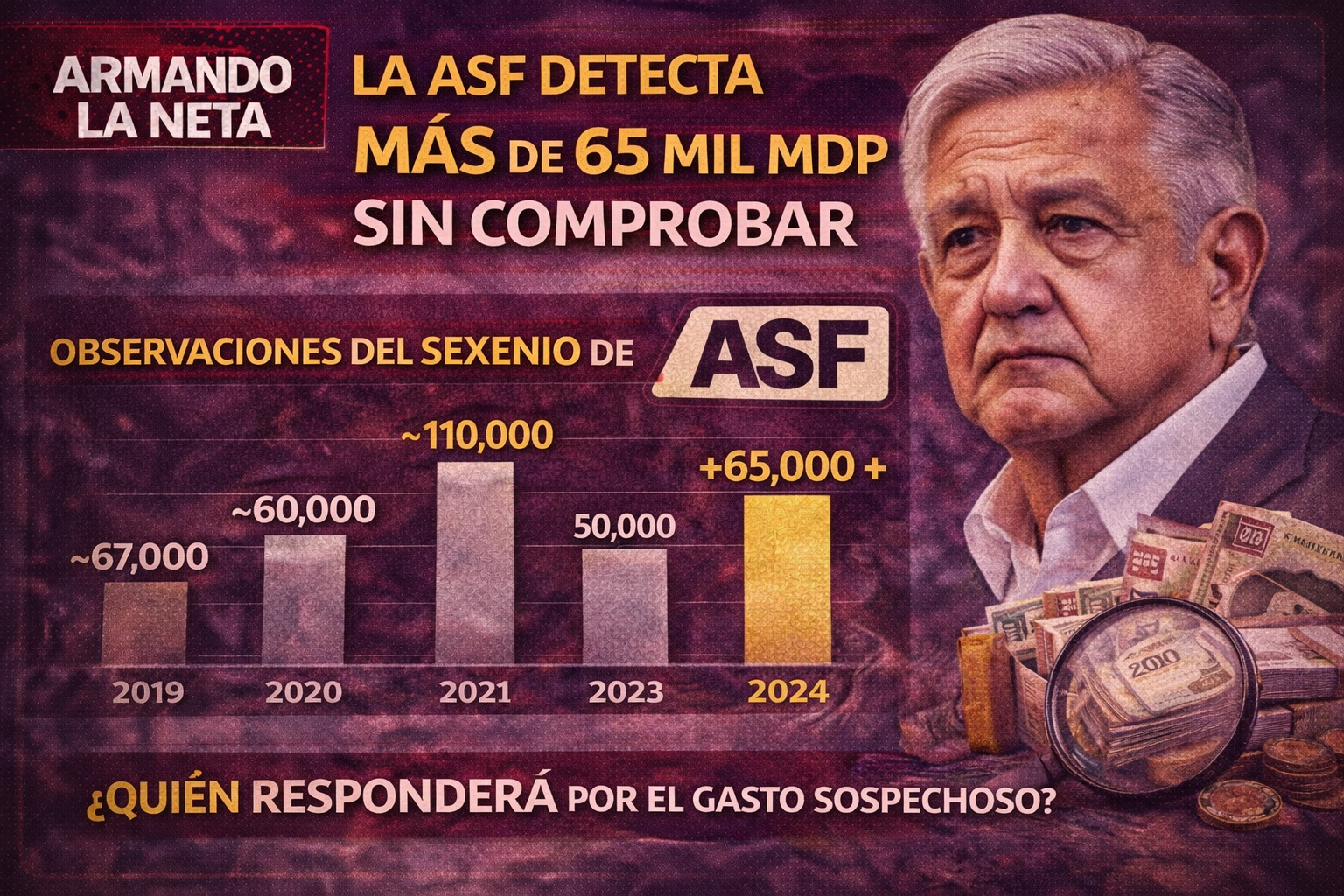 Lunes 2 de febrero de 2026 — Al término del gobierno de Andrés Manuel López Obrador, la Auditoría Superior de la Federación (ASF) sacó un reporte que ha sacudido las cifras oficiales: en el último año del sexenio (2024) se detectaron más de 65 mil millones de pesos en recursos públicos que no están debidamente comprobados o aclarados. Es decir: dinero que fue ejercido, pero cuya documentación para justificar su uso está incompleta, ausente o contradictoria.