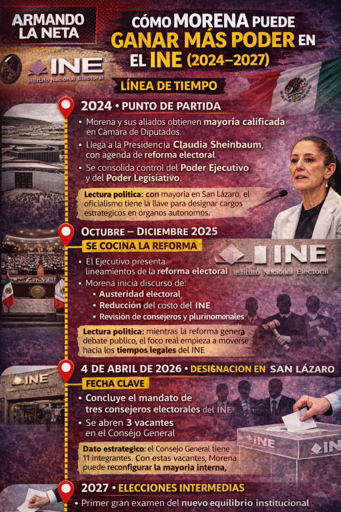 Es decir: incluso si la reforma no prospera en los términos originalmente planteados, el oficialismo puede conseguir una influencia significativa sobre las decisiones técnicas y operativas del INE mediante la designación ordinaria de consejeros afines.